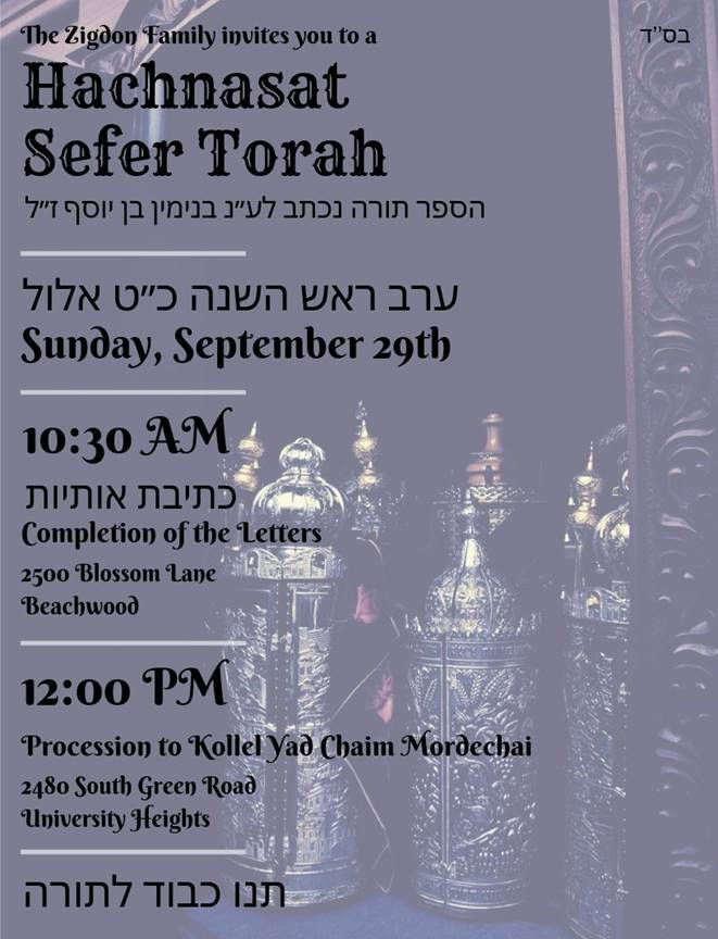 The Hachanasat Sefer Torah will be, Bezrat Hashem, Erev Rosh Hashanah, Sunday, September 29. Completion of the letters will begin at 10:30 am at our home, 2500 Blossom Lane, Beachwood, OH 44122. The procession to Kollel Yad Chaim Mordechai, 2480 South Green Rd., University Heights, OH 44118, will begin at 12PM and will be followed by dancing at the Kollel.