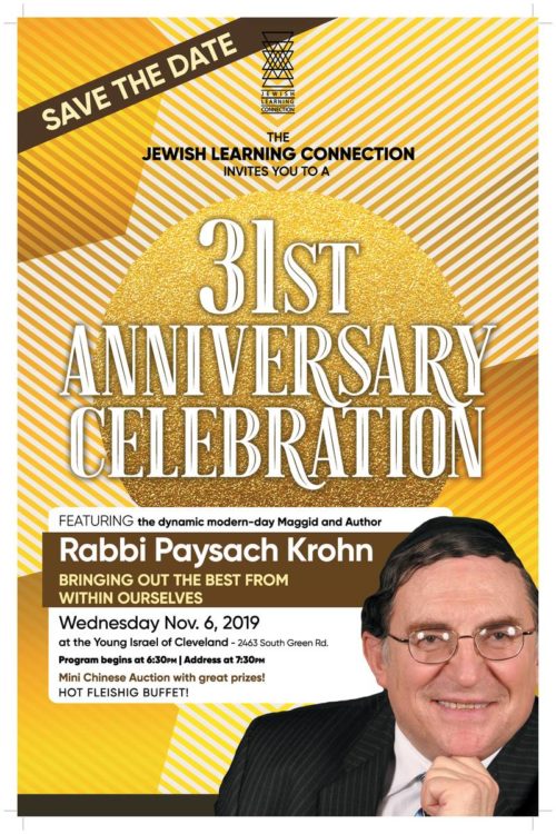 Save the Date! Jewish Learning Connection 31st Anniversary Celebration Featuring Rabbi Paysach Krohn, Wednesday, November 6th