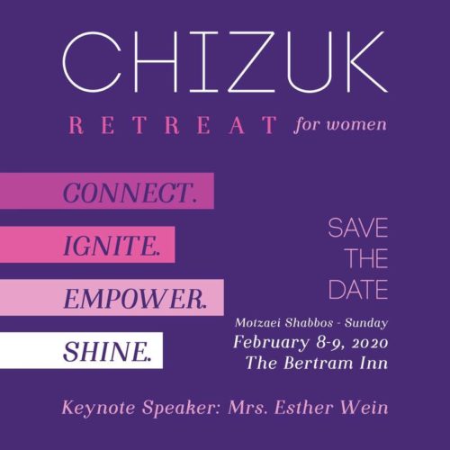 Save the Date! Chizuk Retreat for Women: Motzei Shabbos and Sunday, February 8-9