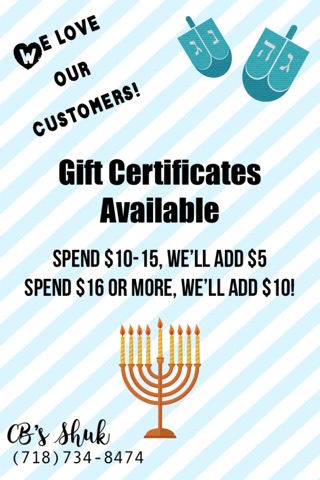 Chanukah at CB’s Shuk! Gift Certificates Available!