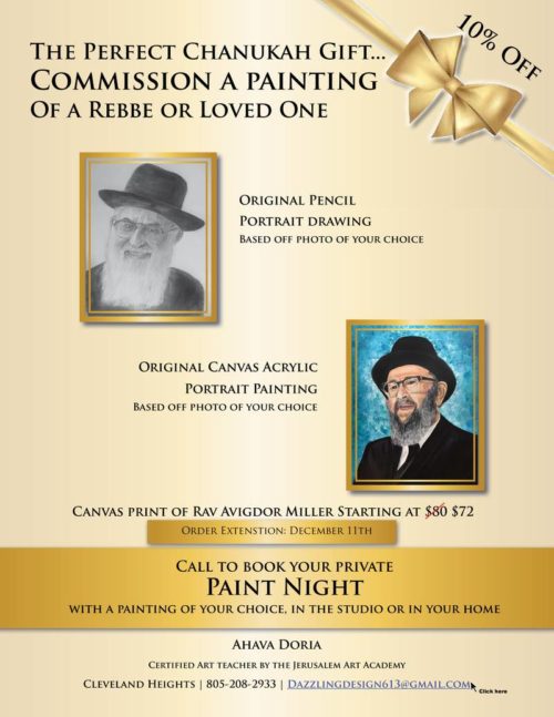 The Perfect Chanukah Gift… December 7, 2019 Leave a Comment Commission a painting of a Rebbe or loved one by Ahava Doria 805-208-2933 | Dazzlingdesign613@gmail.com