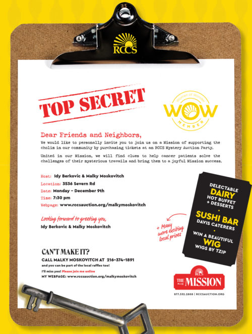 We would like to personally invite you to join us on a Mission of supporting the cholim in our community by purchasing tickets at an RCCS Mystery Auction Party. United in our Mission, we will find clues to help cancer patients solve the challenges of their mysterious travails and bring them to a joyful Mission success.