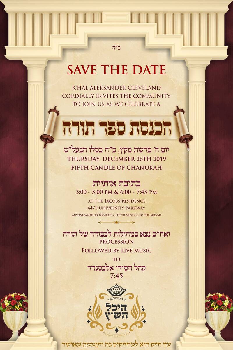 Save the Date! K’hal Aleksander Hachnosas Sefer Torah, Thursday, December 26th!