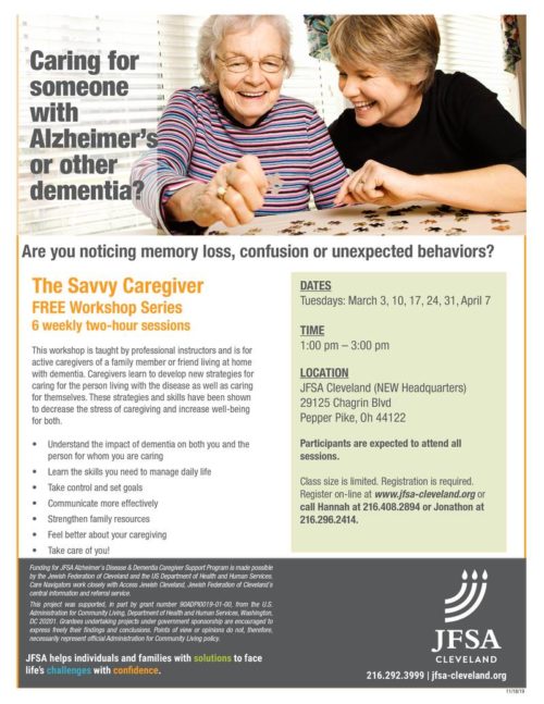 The Savvy Caregiver – Free JFSA Workshop Series, Starting Tuesdays in March February 5, 2020 Leave a Comment