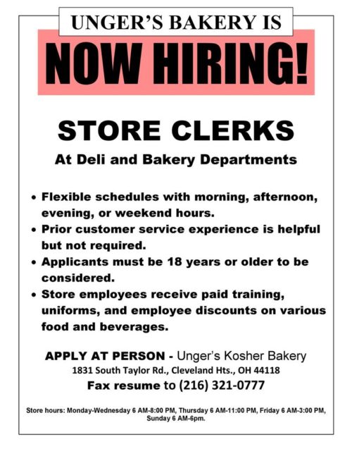 Apply in person at Unger’s Kosher Bakery, 1831 S. Taylor Road, Cleveland Heights, OH 44118.