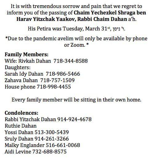 Baruch Dayan Ha’Emes April 1, 2020 Leave a Comment We regret to inform you of the passing of Rabbi Chaim Dahan, ob”m, formerly of Cleveland. המקום ינחם אתכם בתוך שאר אבילי ציון וירושלים