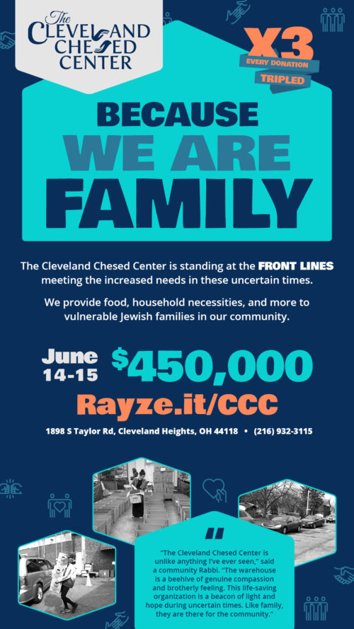 Donate online today at www.clevelandchesedcenter.org, all donations tripled. To volunteer to help with our campaign, please call: 216-932-3115.