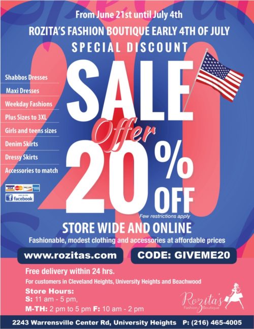 Don’t miss Rozita’s early 4th of July store wide sale. Get 20% off on your favorite styles for all occasions (few restrictions apply). Find fashionable, modest clothing and accessories at affordable prices. Don’t want to leave the house? Shop online at our secure website and use code GIVEME20. Free delivery within 24hrs for customers in Cleveland Heights, University Heights and Beachwood. Sale will run from this Sunday until July 4th.