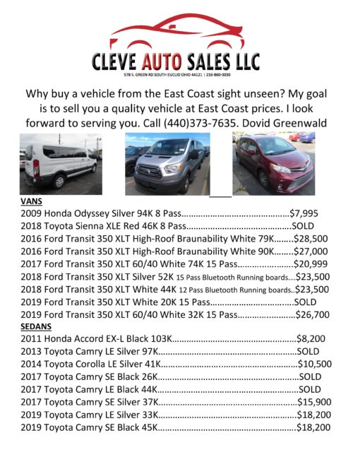 New to Cleveland – Cleve Auto Sales LLC – East Coast Pricing – 440-373-7635