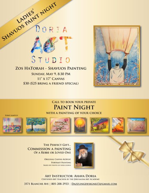 Ladies’ Paint Night At the Doria Art Studio May 4, 2021 Leave a Comment Shavuos Painting Sunday, May 9, 8:30 PM 11” x 17” Canvas $30 ($25 bring a friend special) 805-208-2933 | Dazzlingdesign613@gmail.com