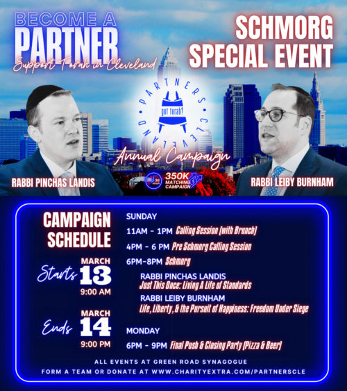 The Partners Cleveland Annual Campaign will take place Sunday, March 13 – Monday, March 14. As part of the Campaign, there will be a special Schmorg Sunday, March 13 at 6 pm at Green Road Synagogue with special guest, renowned speaker and author, Rabbi Leiby Burnham from Partners Detroit. This is not a Schmorg that you want to miss!