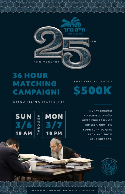 Torah L.I.F.E. Institute 25th Anniversary 36 Hour Matching Campaign! March 8, 2022 Leave a Comment To donate visit tlk25.com. To place a reservation for the dinner visit reservations.tlk25.com/.