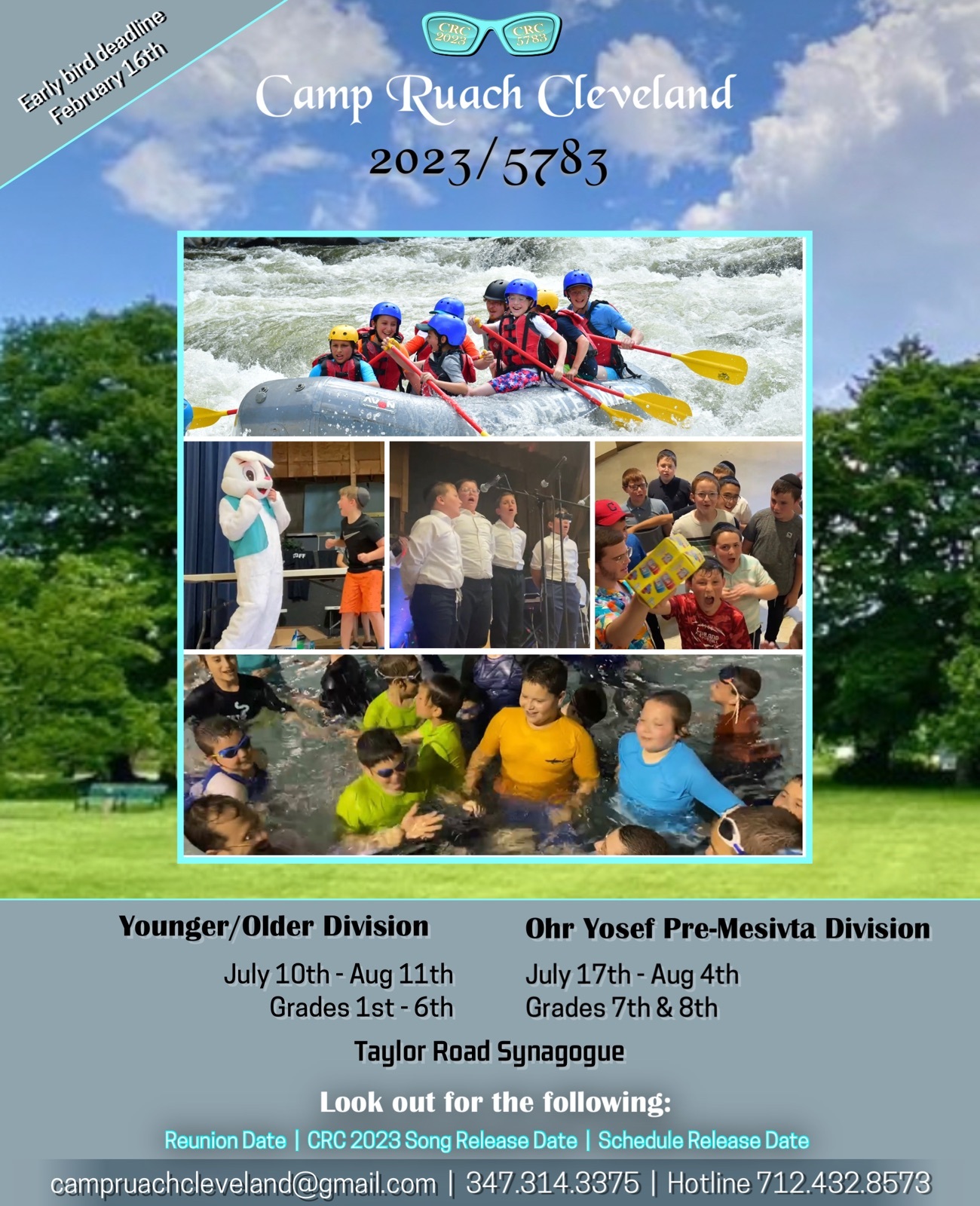Camp Ruach Cleveland Registration Now Open – Early Bird Until February 16th February 9, 2023 Leave a Comment Register at forms.gle/FmXcL2rUqR8n7vDa7. Pre mesivta: drive.google.com/file/d/1O-3DbyTPAb_VjNuSb98ngg4sJodeJS64/view?usp=share_link CRC form: drive.google.com/file/d/1qLN2YwGUo0xDKBmeOC48D-aBgOvcuPNw/view?usp=share_link