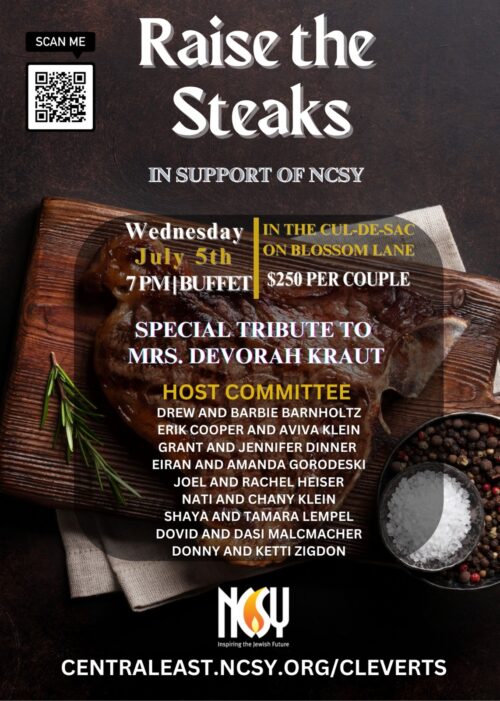NCSY Raise the Steaks! Wednesday, July 5th June 24, 2023 Leave a Comment Support the amazing work of NCSY with a delicious and elegant steak dinner. July 5th at 7pm centraleast.ncsy.org/cleverts Any questions please call Rabbi T 443-468-7861″