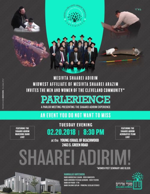 Mesivta Shaarei Adirim “Parlerience” for Men and Women, Tuesday Evening!