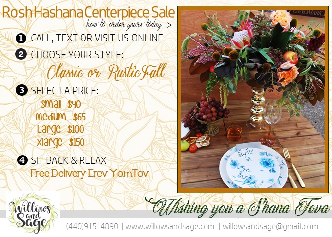 Hurry and reserve your Rosh Hashana centerpieces today. Choose between our beautifully Fall Rustic style or a Fresh and Classic style. Limited quantity available. Sales close 9/12.