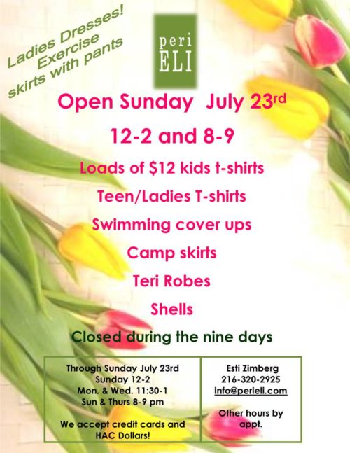 Hurry! Peri Eli is Open Sunday, July 23rd; Closed During the Nine Days