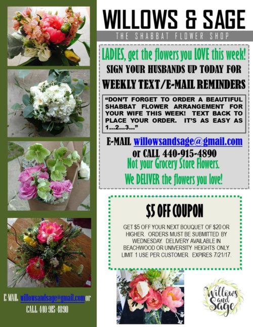 It’s time to order your Shabbat bouquet TODAY! We’re headed out to the farm to get an assortment of this summer’s freshest and most beautiful blooms! These are definitely not your grocery store flowers! Order an arrangement today by e-mailing us at willowsandsage@gmail.com or texting/calling 440-915-4890. Delivery available. Plus, sign up your husband, friends, brothers, fathers, or significant others for our weekly flower reminders.