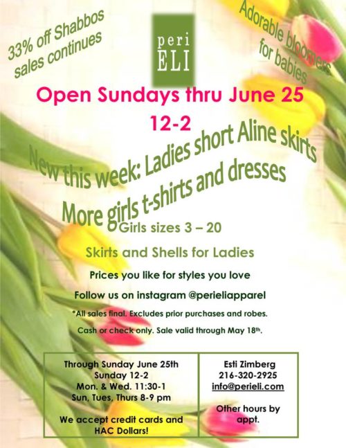 Peril Eli 33% Off Shabbos Sales Continue; Open Sundays Through June 25 from 12-2pm