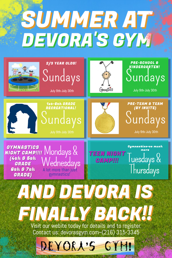 Devora is finally back home, and we are gearing up for a fantastic summer at Devora’s Gym! Join us in our recreational classes for girls aged below preschool through 6th grade, Pre-Team and Team training, and 2 fantastic night camps! Visit Devorasgym.com for more info and registration, or text 216-315-3345.
