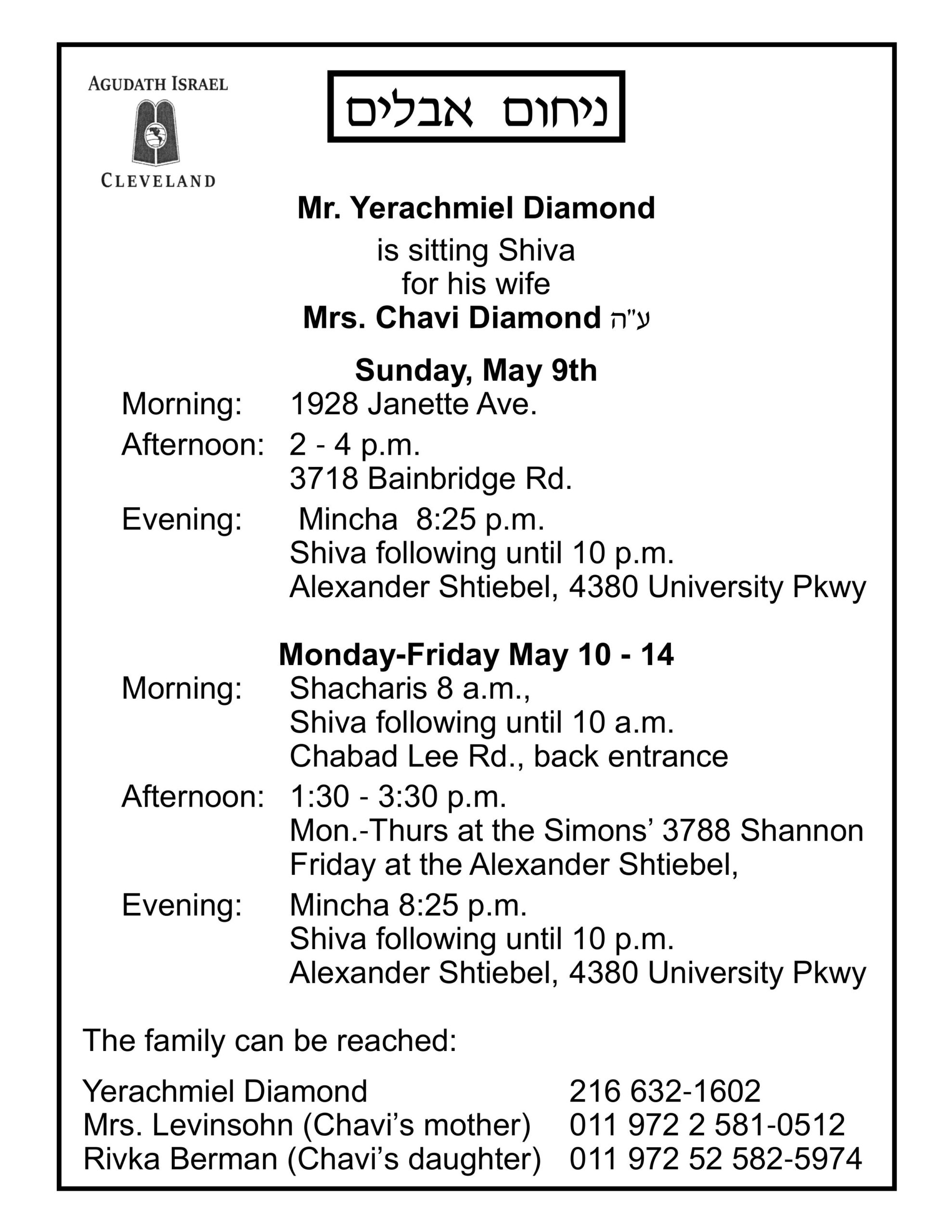 Etta Winer will be sitting shiva for her father, Dr. Bernard Kabakow, Baruch ben Zvi Hersh Z”L, in New York starting this Monday afternoon. She can be reached by phone at 216-513-4680, 347-677-0572, or email at ettawiner@yahoo.com.