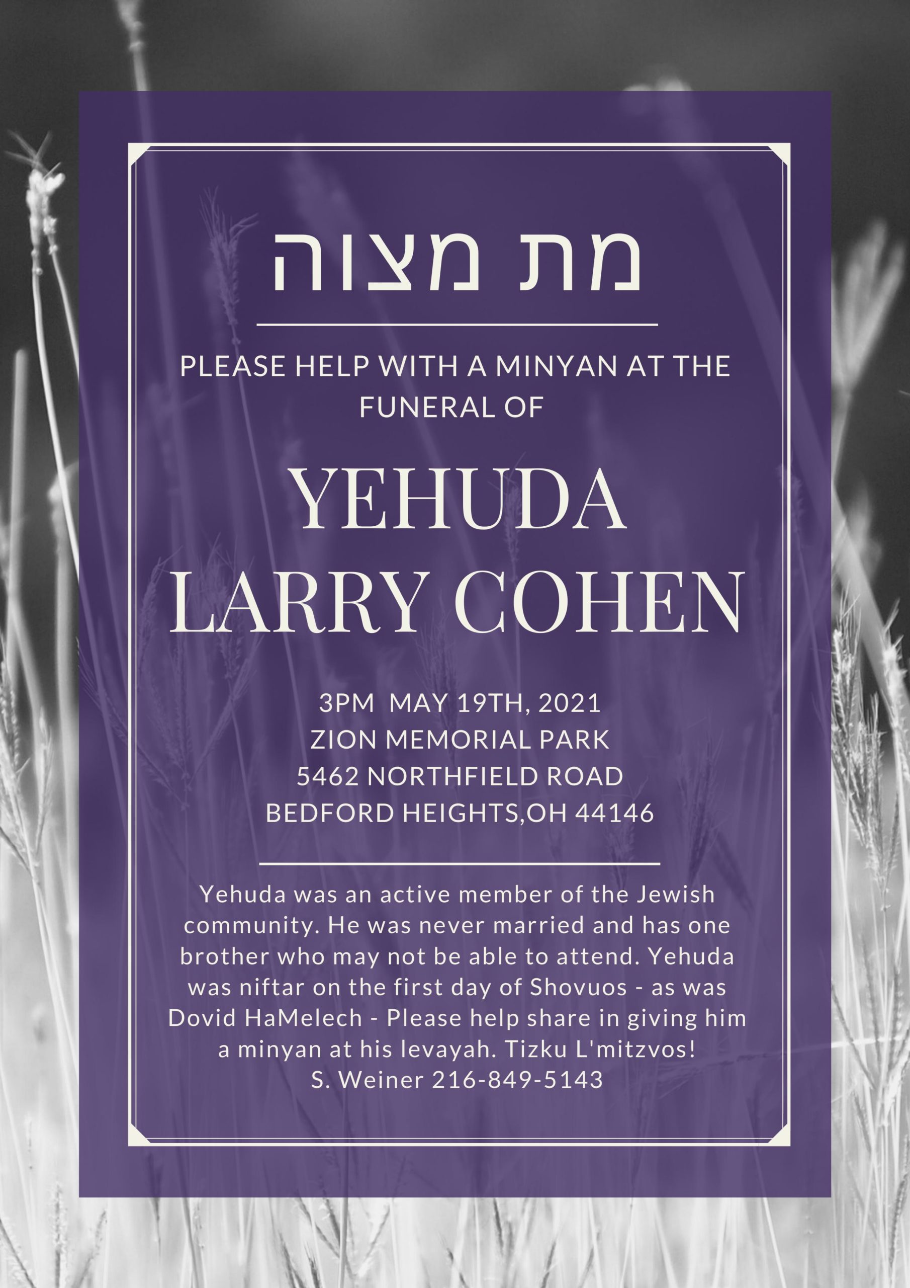 Baruch Dayan Ha’Emes; Levaya Today, Wednesday at 3pm