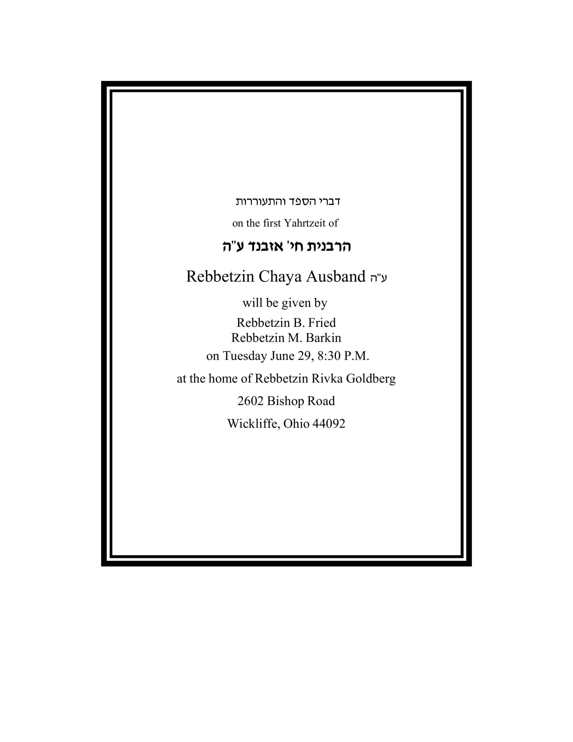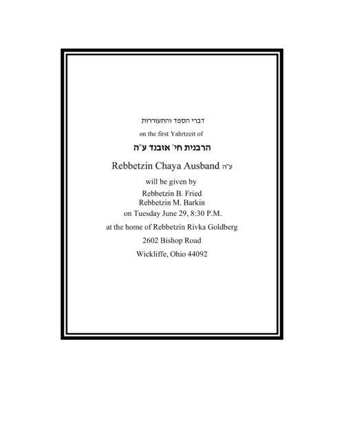 Yahrtzeit of Rebbetzin Chaya Ausband, a”h, Tuesday Evening