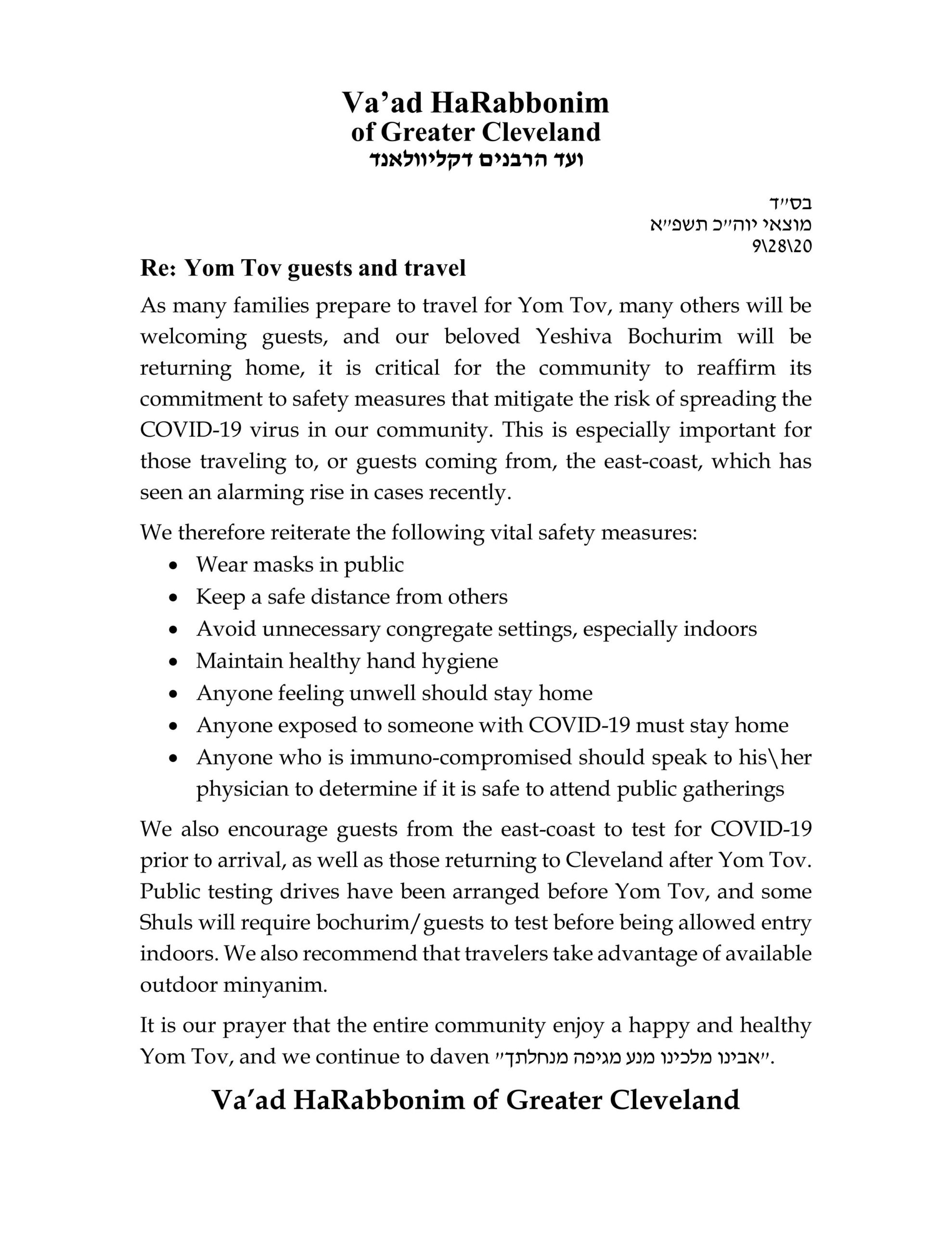 Vaad HaRabbonim Statement Re: Yom Tov Guests and Travel