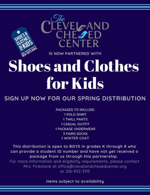 The Cleveland Chesed Center is conducting our third Shoes and Clothes for Kids distribution. This distribution is open to boys in grades K through 8 who can provide a student ID number. It will include 1 polo and 1 uniform type pants, 1 casual outfit, 1 package of underwear, 3 pairs of socks, and 1 coat. Items are provided as available. Due to Payless Shoes filing for bankruptcy, there will be no shoes or shoe cards with this distribution. Up to 5 children per family may register. The link to register is: https://goo.gl/forms/zutNMDpLZgyjzseG3. All families at or below 200% FPIG or with demonstrated need are eligible. Please call 216-932-3115 or email office@clevelandchesedcenter.org with any questions.