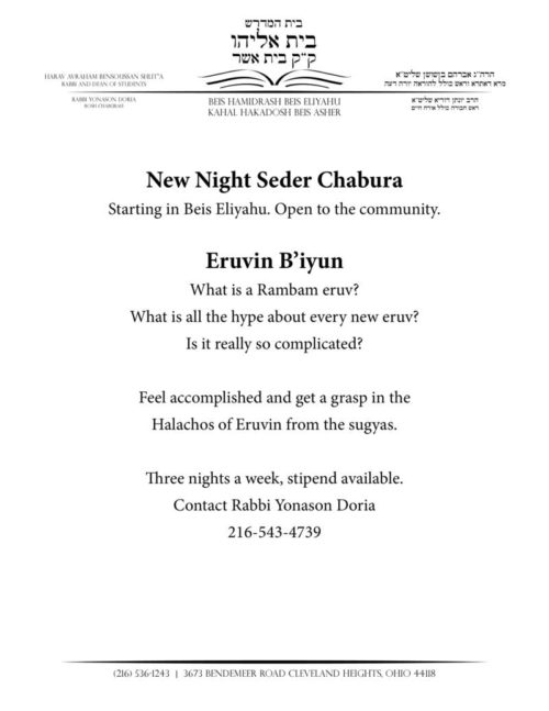 New night seder chabura in Beis Eliyhau. Stipend available. Please contact Rabbi Yonason Doria at Rabbidoria@gmail.com, 216-543-4739, or 805-208-2933.
