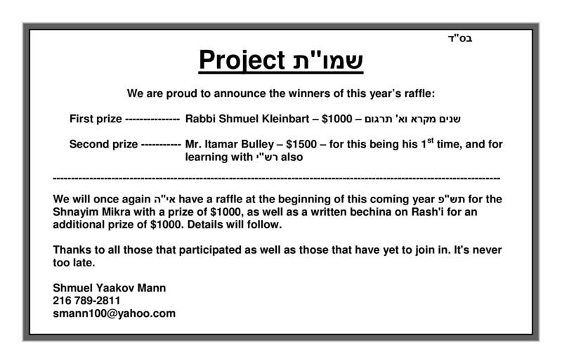 We will once again אי”ה have a raffle at the beginning of this coming year תש”פּ for the Shnayim Mikra with a prize of $1000, as well as a written bechina on רש”י for an additional prize of $1000. Details will follow.