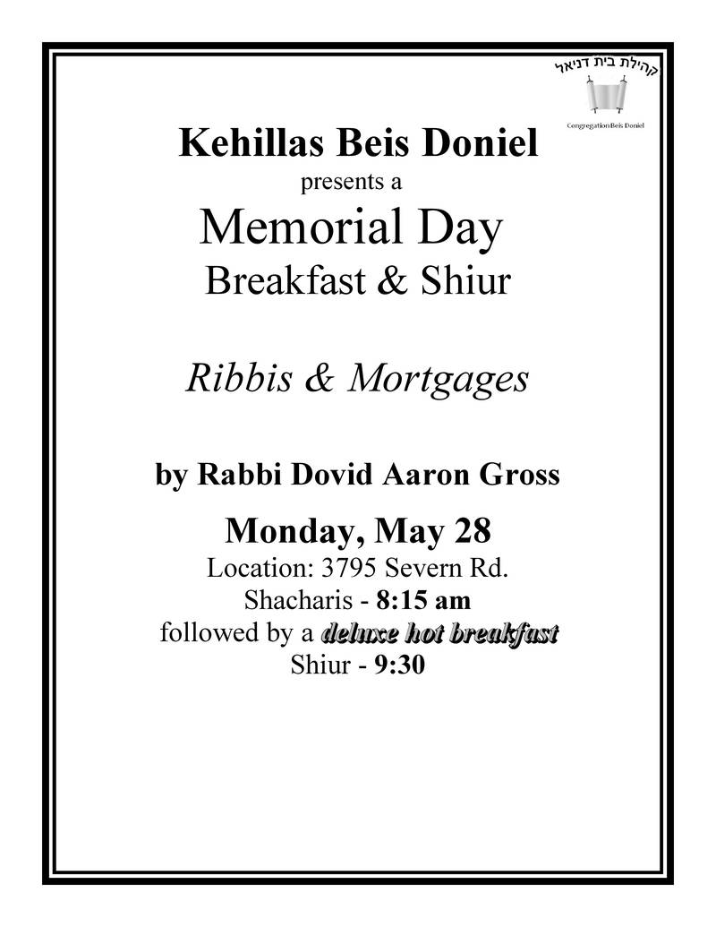 Beis Doniel Memorial Day Breakfast & Shiur: “Ribbis & Mortgages”
