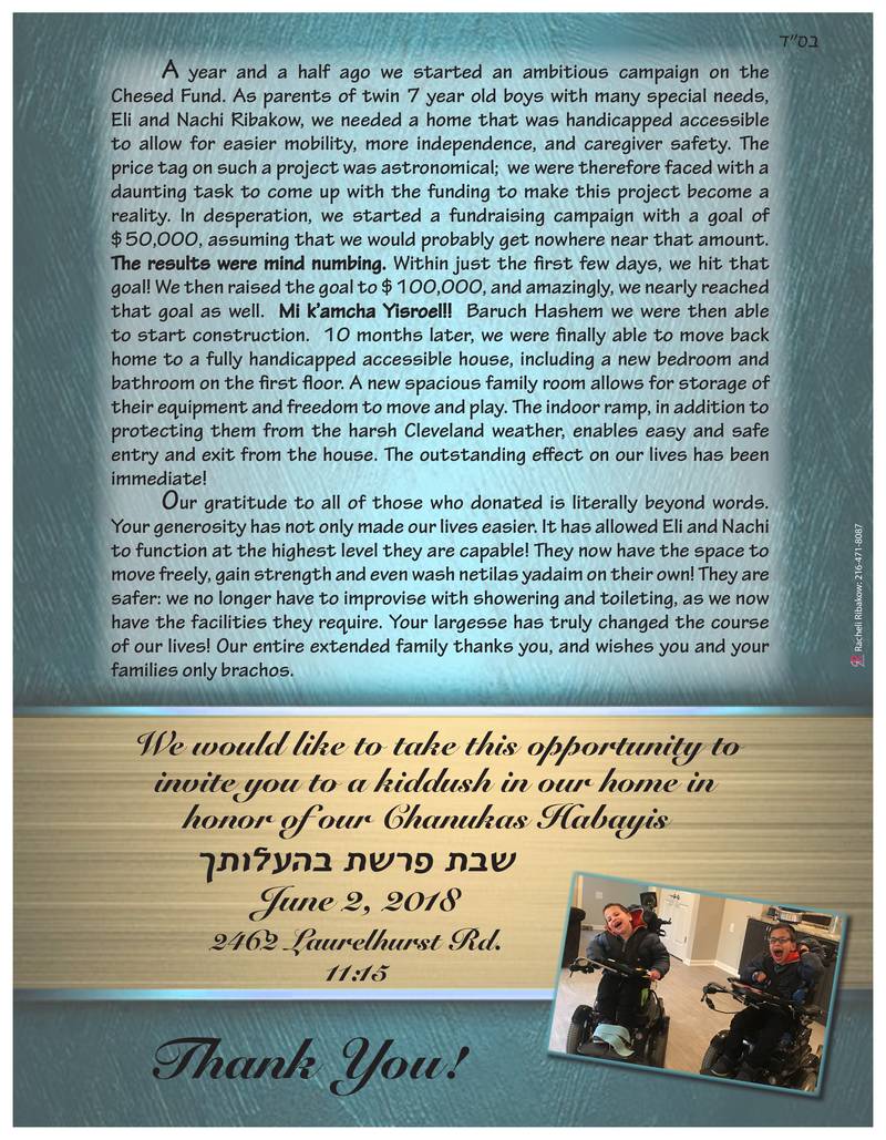 With a Heartfelt Thank You, the Ribakows Invite the Community to a Kiddush This Shabbos in Their Newly Renovated Handicapped Accessible Home