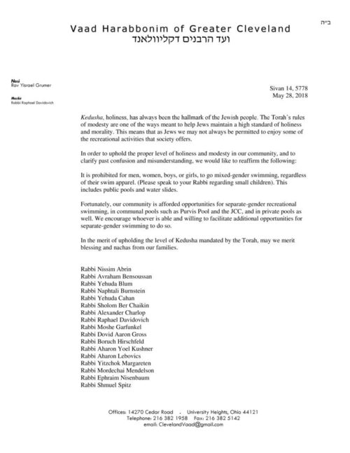 Fortunately, our community is afforded opportunities for separate-gender recreational swimming, in communal pools such as Purvis Pool and the JCC, and in private pools as well. We encourage whoever is able and willing to facilitate additional opportunities for separate-gender swimming to do so.