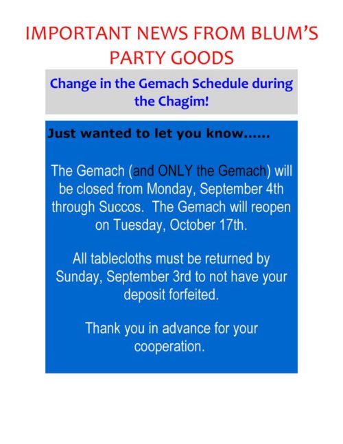 Blum’s Gemach Schedule Update
