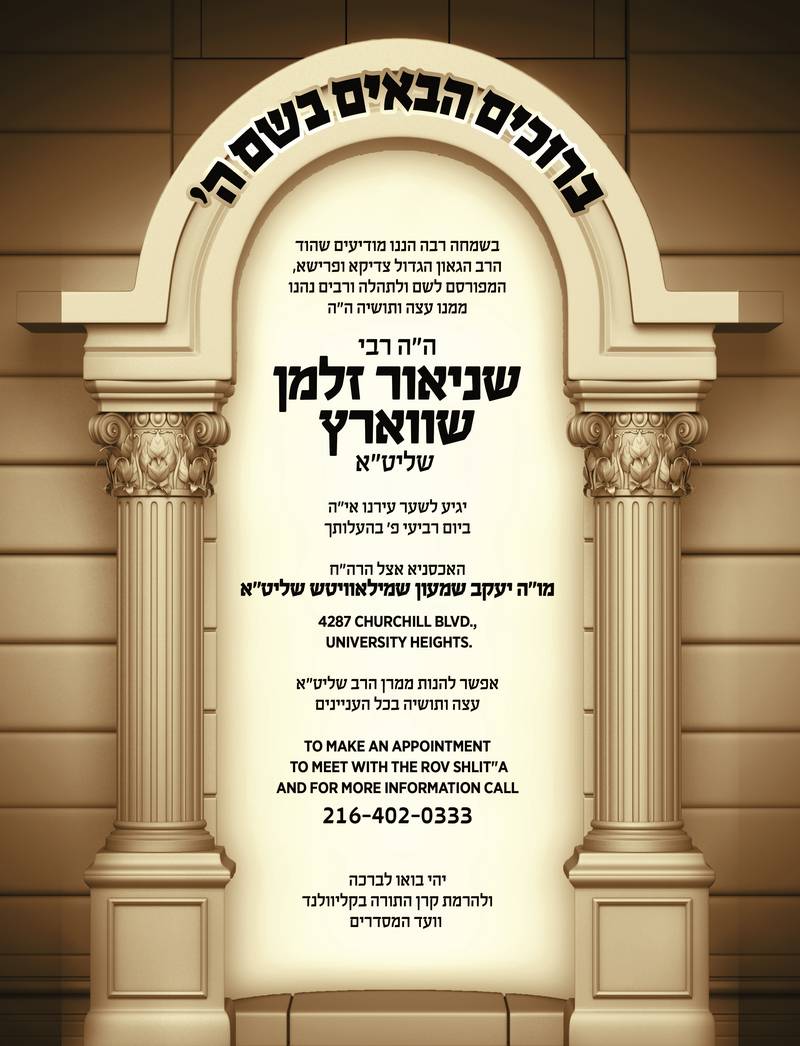 Shiva will be in Cleveland starting with Maariv on Tuesday at 10pm.