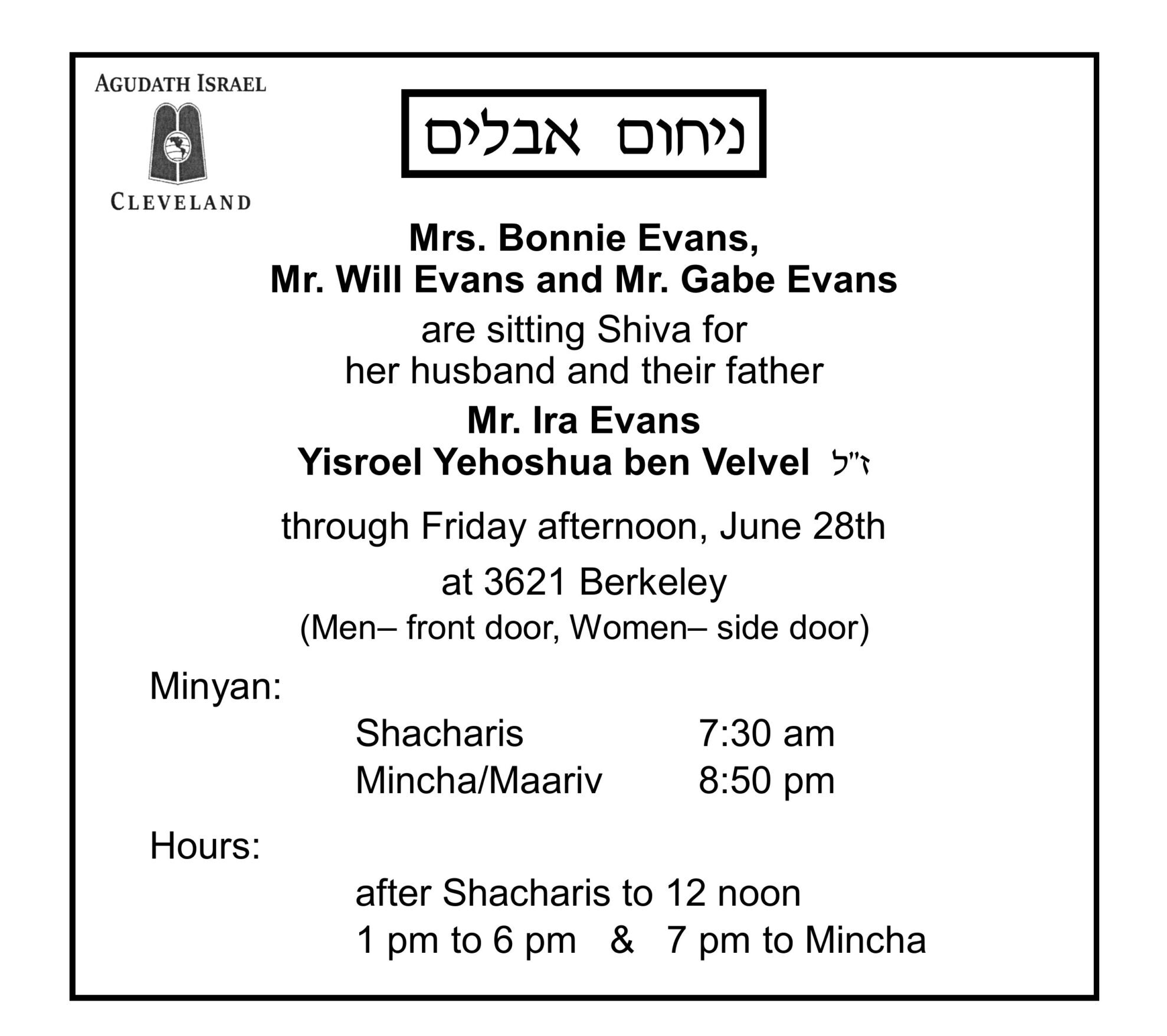 Shiva will be at 33325 Rockford Drive, Solon Ohio: