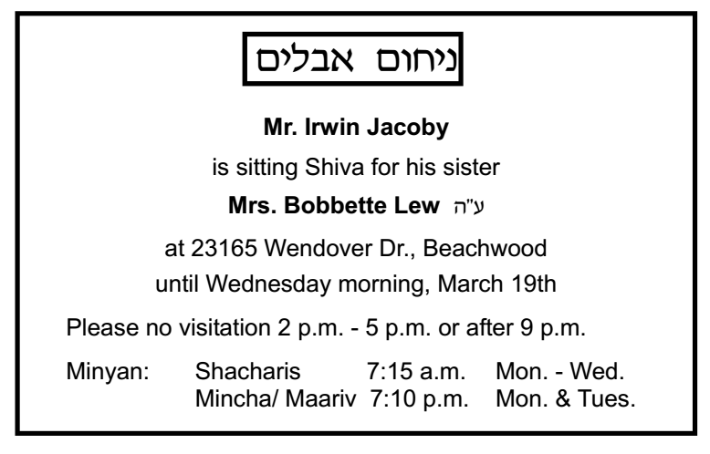 We regret to inform you of the passing of Matthew Kalman, brother of Michael Kalman. Funeral already occurred in Boston. Shiva will be at his home, 3704 Berkeley Road in Cleveland Heights, starting Tuesday morning until Sunday morning. Minyanim: Shacharis: 7:00 am, Mincha/Maariv: 7:15 pm.