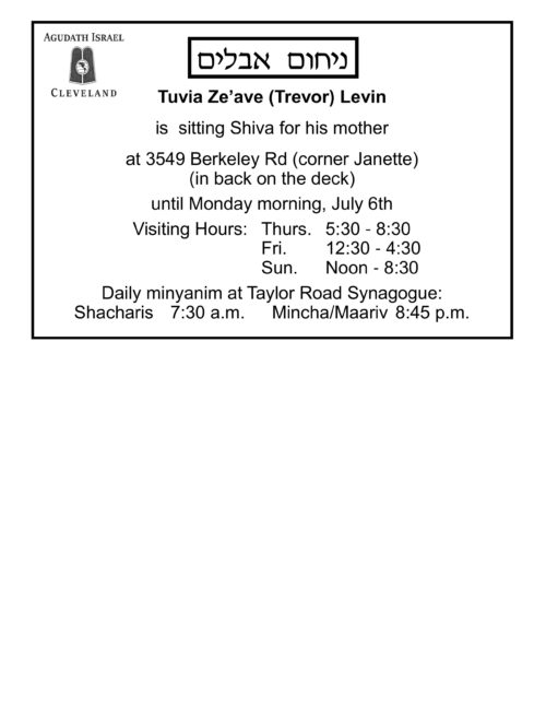 Shiva will be at the Leeson Home, 3566 Severn Road, in Cleveland Heights 10-12 am and 7-9 pm beginning Wednesday, October 28.