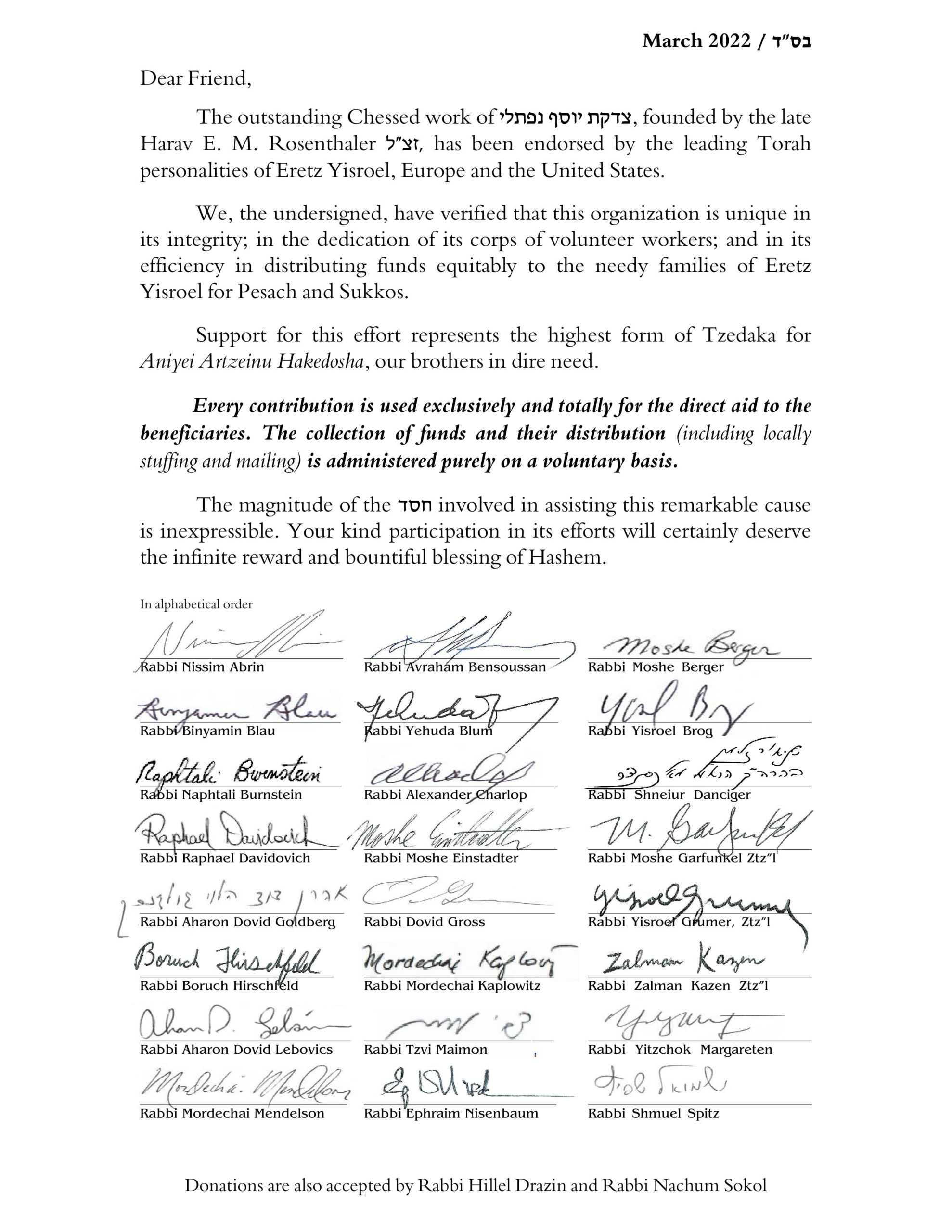 The Tzidkas Yoseph Naphtali mailing should be arriving around April 9th. The mailing goes to Rabbi Burnstein and Rabbi Hirschfeld. Alternatively, please donate using one of the methods listed below. Time is short and there is much need.