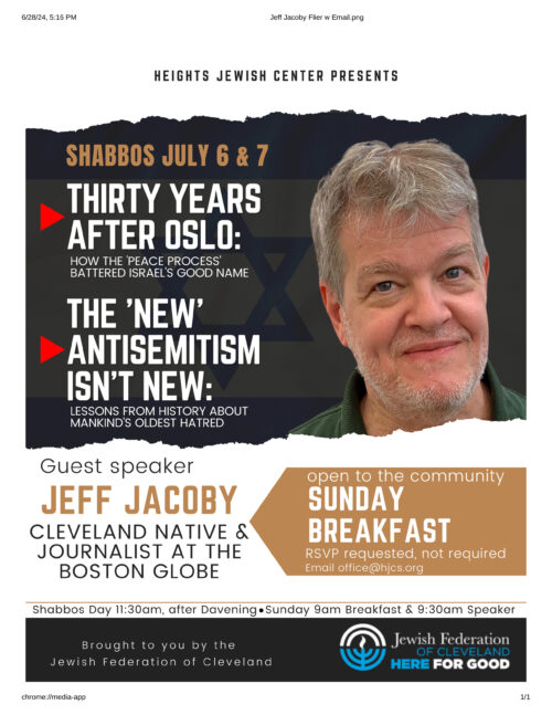 Heights Jewish Center Presents Jeff Jacoby, this Shabbos and Sunday