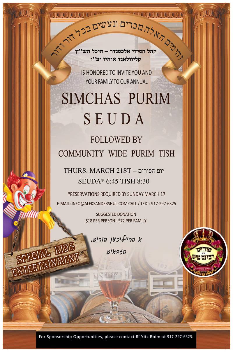 Seudas Purim and Community-Wide Purim Tish at K’hal Chasidei Aleksender