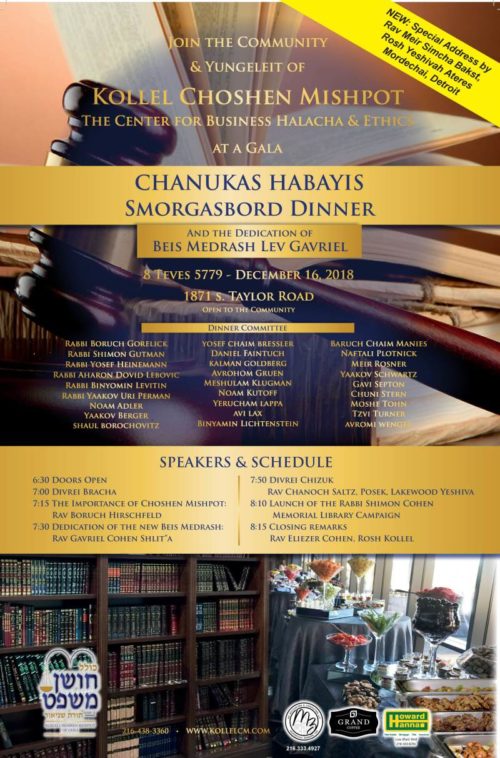 Chanukas Habayis of Kollel Choshen Mishpot, Sunday, December 16th