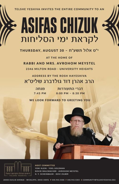 Telshe Yeshiva Asifas Chizuk with HaRav Goldberg Thursday Evening, 8/30, in University Heights