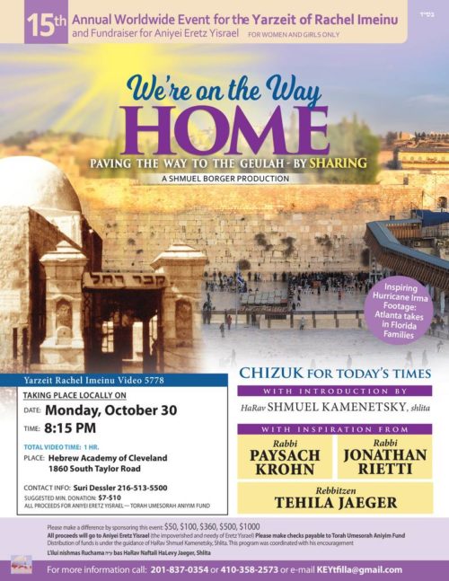 “We’re On The Way Home: Paving The Way To The Geulah – By Sharing”, will be shown starting Oct. 30 in locations around the world. This year’s video focuses on the middah of “sharing”. With an intro by HaRav Shmuel Kamenetsky, shlita, words of inspiration from Rabbi Paysach Krohn, Rabbi Jonathan Rietti, & Rebbitzen Tehila Jaeger. For women and girls only. All proceeds go to aniyei Eretz Yisroel.