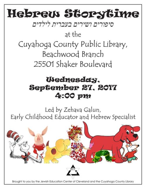 Joining us at Hebrew Storytime, a Hebrew and English story hour, at the Beachwood Branch of the Cuyahoga County Public Library on Wednesday, September 27, 2017, at4:00 pm. Zehava Galun, an Early Childhood Hebrew specialist, will lead the Hebrew story hour for children ages 2 through 7. Hebrew Storytime at the library is brought to you by the Jewish Education Center of Cleveland and Cuyahoga County Public Library. Please invite your friends and family!
