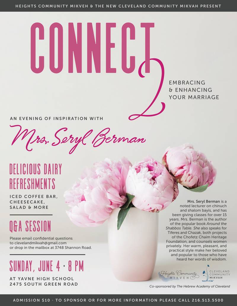 An elegant night out for married women of all ages and stages featuring popular lecturer Mrs. Seryl Berman, a delicious dairy reception and an interactive Q&A Session. For more information email clevelandmikvah@gmail.com or call 216-513-5500.