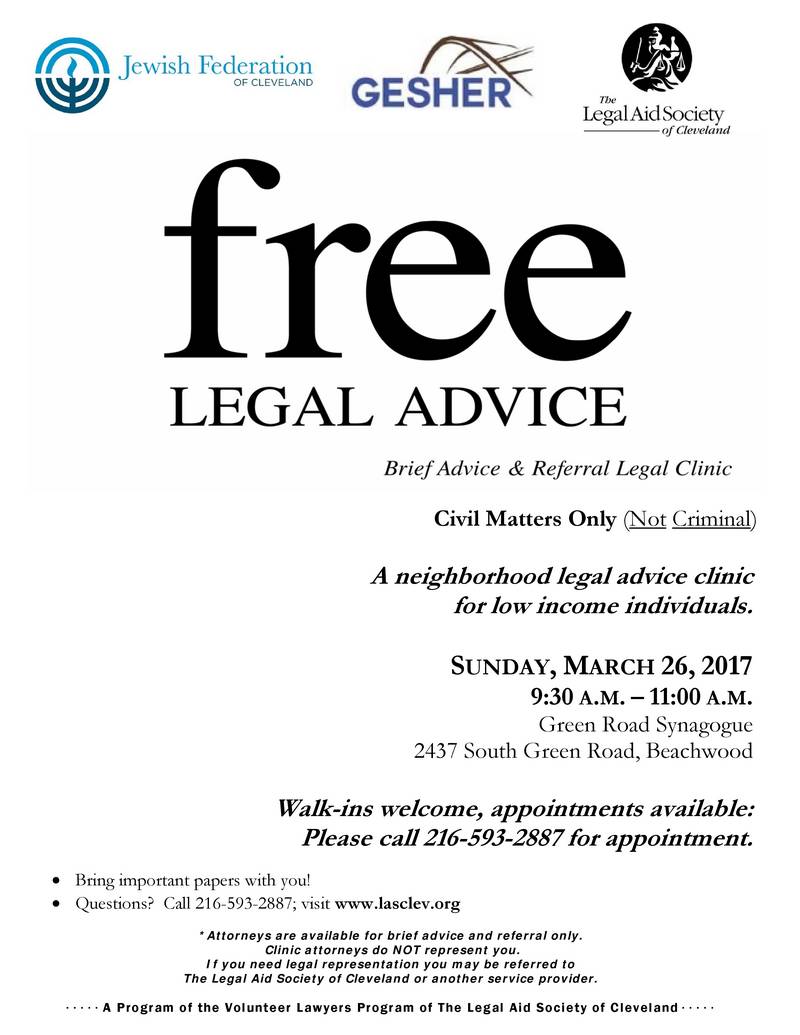 Gesher, The Jewish Federation of Cleveland & Legal Aid are excited to offer a free legal advice clinic this Sunday, March 26th at Green Road Synagogue between 9:30 and 11:00 a.m.