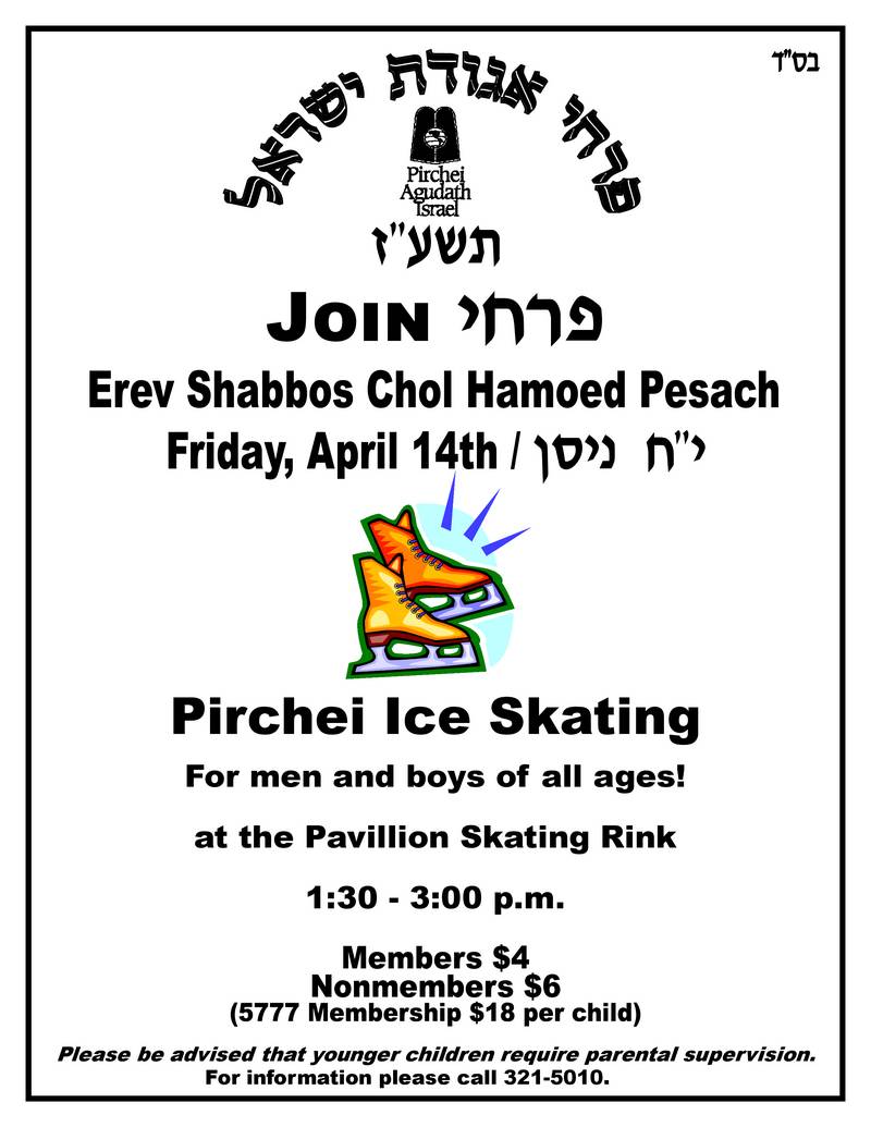 Pirchei Ice Skating for Men and Boys, Erev Shabbos Chol Hamoed, April 14th