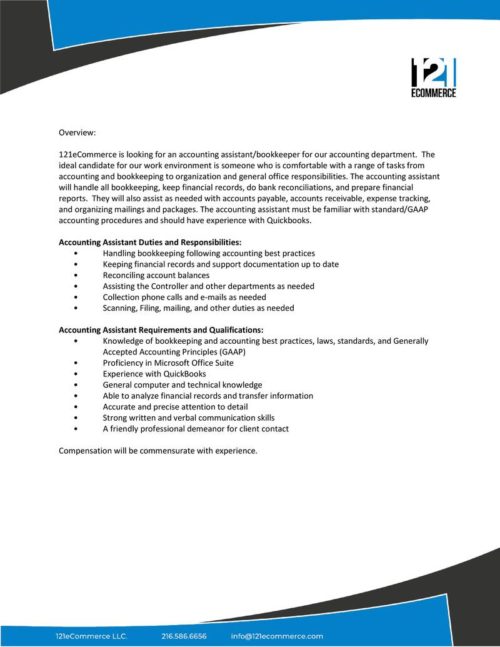 121eCommerce is looking for an accounting assistant/bookkeeper for our accounting department. The ideal candidate for our work environment is someone who is comfortable with a range of tasks from accounting and bookkeeping to organization and general office responsibilities. The accounting assistant will handle all bookkeeping, keep financial records, do bank reconciliations, and prepare financial reports. They will also assist as needed with accounts payable, accounts receivable, expense tracking, and organizing mailings and packages. The accounting assistant must be familiar with standard/GAAP accounting procedures and should have experience with Quickbooks.